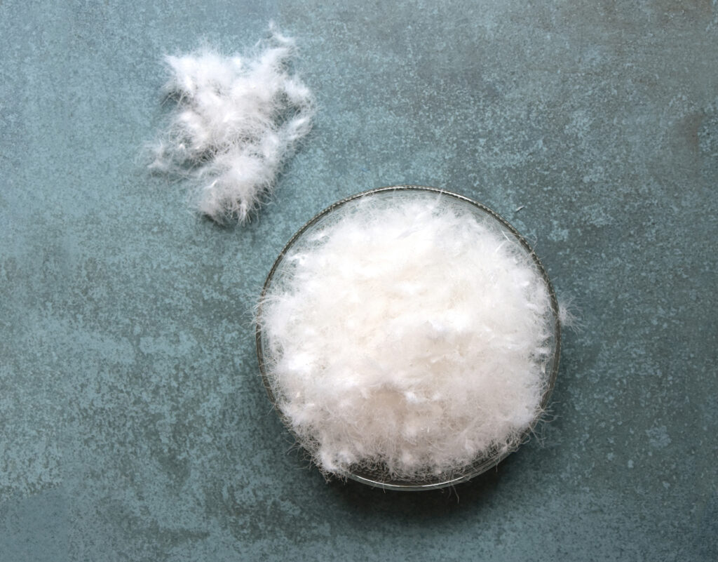 Negli anni '90 il mercato delle imbottiture del letto richiede anche l’impiego di nuove materie prime in alternativa o in aggiunta alle piume. Iniziamo così un’intensa attività di studio e ricerca per sperimentare l’utilizzo di fibre sintetiche o naturali (mais, viscosa, tencel,…) attraverso processi innovativi, sviluppando un nuovo polo produttivo per la trasformazione e miscelazione di prodotti down alternative.